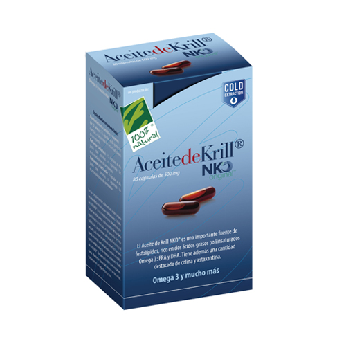 El aceite de krill de Cien por Cien Natural aporta ácidos grasos esenciales como omega 3 de cadena larga (en forma de EPA y DHA), fosfolípidos (componente de todas las membranas de las células) y astaxantina (potente carotenoide que da al krill su color rojo/anaranjado). También contiene omega 6 y omega 9, pequeñas cantidades de vitaminas A, D, E y es una fuente importante de colina. En noruego, krill significa “alimento para las ballenas” y esta palabra sirve para denominar esas nubes de minúsculos crustáceos que forman los bancos de zooplancton. La especie más conocida de estos crustáceos que se encuentra esencialmente en las aguas frías de la Antártida es la Euphausia superba, una gamba que mide entre 0.6 y 10 cm. Es esta especie objeto de estudios muy prometedores.