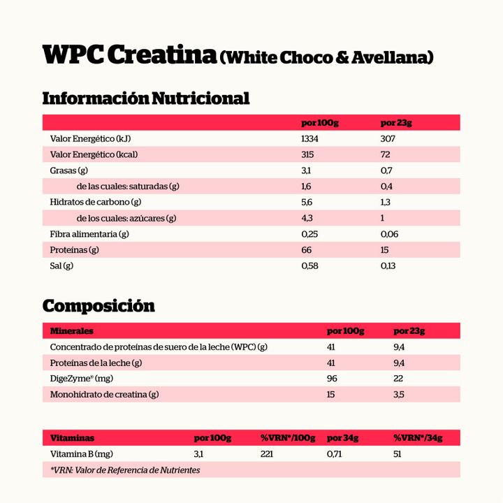 Ingredientes: Concentrado de proteína del suero de la leche (Whey Protein Concentrate), proteínas de la leche, creatina monohidrato (Creapure®), aromas, edulcorantes (acesulfamo potásico, sucralosa), complejo multienzimático DigeZyme® [alfa-amilasa (Aspergillus oryzae), proteasa (Bacillus subtilis), lactasa (Aspergillus oryzae), lipasa (Rhizopus oryzae), celulasa (Trichoderma longibrachiatum), maltodextrina], clorhidrato de piridoxina (vitamina B6). Composición por 100 g por 23 g Concentrado de proteínas de suero de la leche (WPC) (g): 41 / 9,4 Proteínas de la leche: 41 / 9,4 DigeZyme® (mg): 96 / 22 Monohidrato de creatina (g): 15 / 3,5Advertencias y/o riesgos